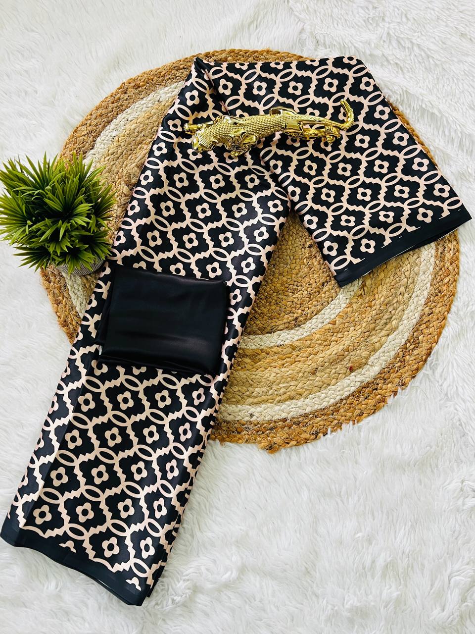 Saree work : Digital Print Border with Ajrakh Rich Pallu With Contrast Blouse